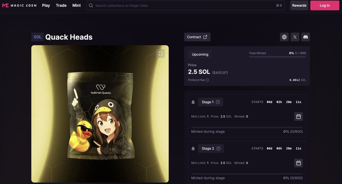If you’re eligible, you’ll need a Solana-compatible wallet, such as Phantom, $SOL tokens for gas, and 2.5 $SOL to cover the NFT price.